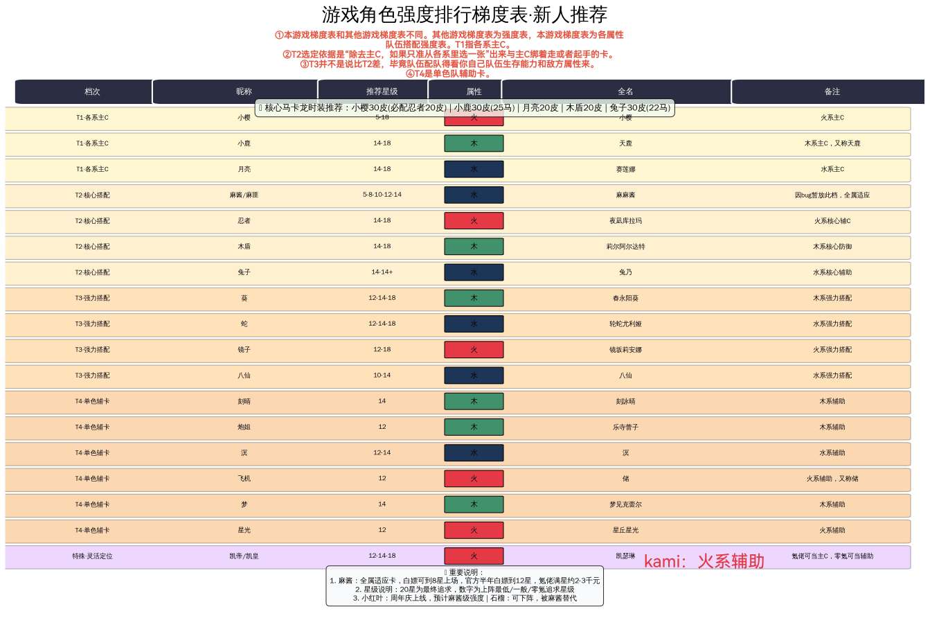 因为这个游戏不能和其他游戏一样,从T0排到t3这样子按强度排(除了目前的千夏和麻匪)。所以不要看着图片角色卡牌排位的先后顺序就说强度有问题,这不是强度表,是可用的角色分析表。请仔细看清楚所有的文字说明。